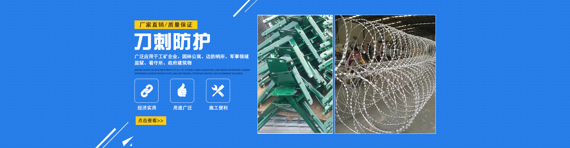 安平初日絲網(wǎng)有限公司是一家專業(yè)的絲網(wǎng)生產(chǎn)銷售廠家,主要產(chǎn)品有刀片刺繩、刺絲滾籠、刺繩支架等產(chǎn)品,公司為客戶提供產(chǎn)品知識和新鮮是市場行情,回答用戶產(chǎn)品相關問題,幫助用戶更好的選購產(chǎn)品。